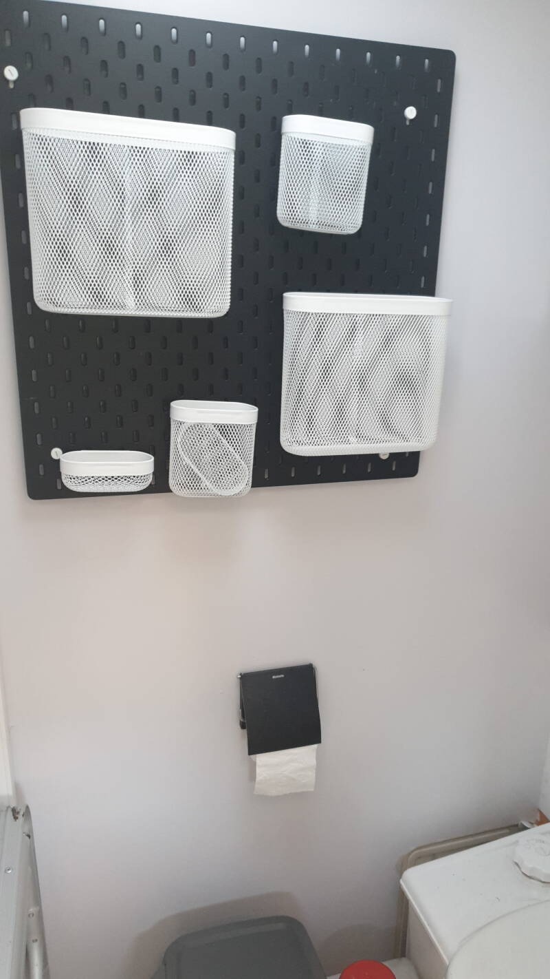 We gaan nog even naar Ikea want daar verkopen ze-volgens Wim uit Zwolle- een ideaal rek met gaatjes voor het toilet cq badkamer. Het rek is gevonden en is opgehangen ; het werkt inderdaad perfect!