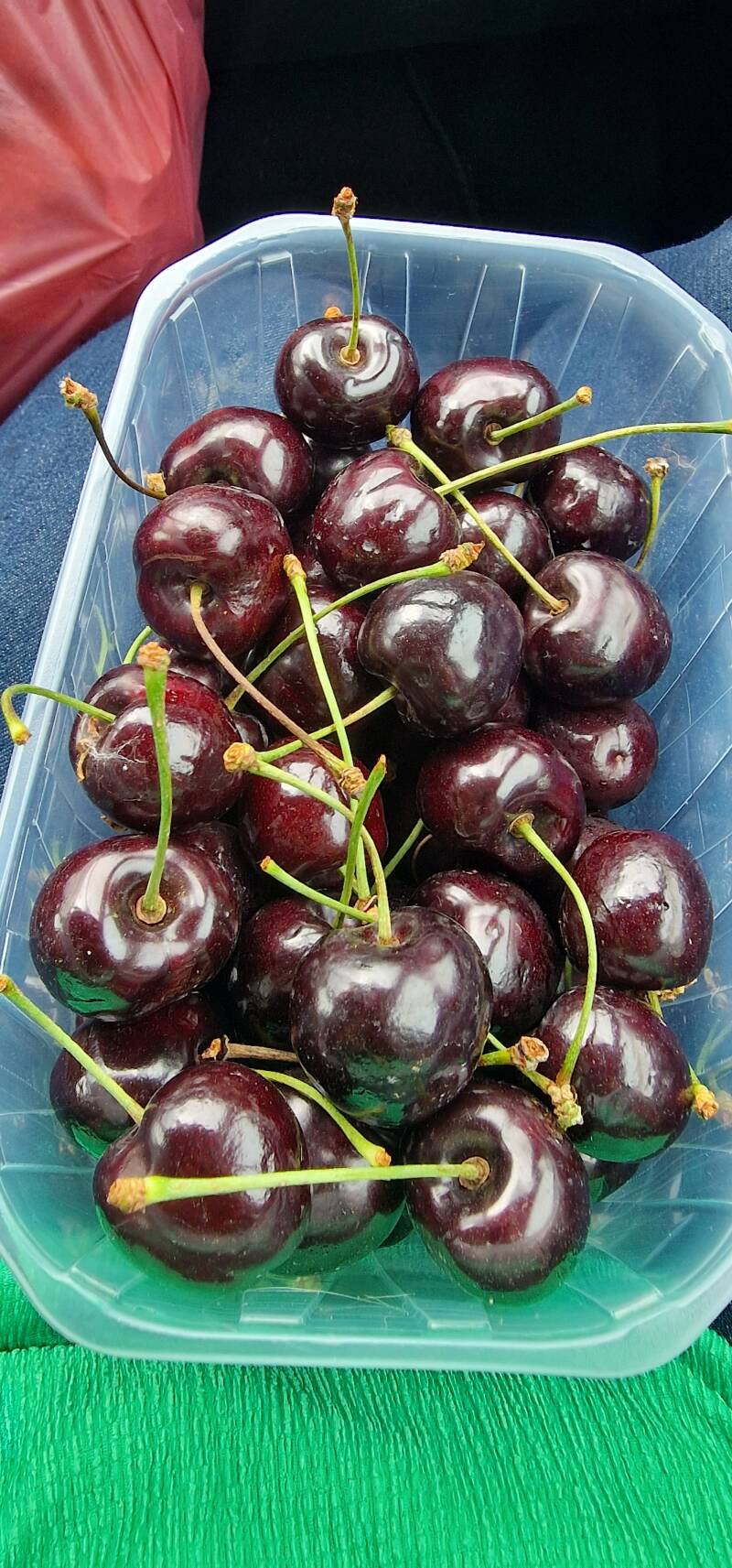 Na talloze weggetjes, karresporen en een stukje snelweg gaan we richting camping. En dan komen we langs ern fruitstalletje, appel en kersen..... we nemen van allebei een zak/bak mee. De appels heb ik nog niet geproefd, de kersen daarentegen....zo lekker heb ik ze lang niet gegeten!